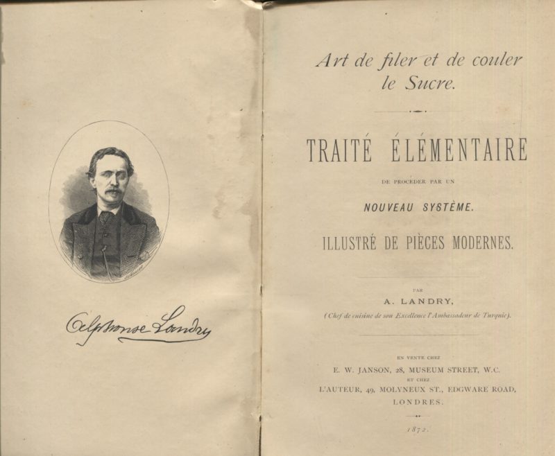 In 16, pp. 65 + VIII Planches fuori testo. Legatura tutta tela con titoli in oro sul piatto anteriore. Finalini, testatine e capilettera xilog. Errata corrige. Fogli di guardia gialli. Etichetta cartacea sul dorso superiore. Tratto da Auction FR, Lotto 117: Édition ORIGINALE EXTRÊMEMENT RARE. Alphonse Landry était chef de cuisine de Constantin Musurus Pacha, Ambassadeur de Turquie à Londres. Le livre est dédié à ce personnage. Portrait de l’auteur au verso du faux-titre. Belle typographie avec ornements. rilegato Molto buono (Very Good) (6978)