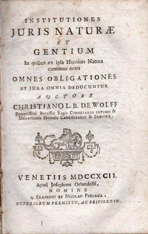 Institutiones juris naturae et gentium in quibus ex ipsa hominis natura continuo nexu omnes obligationes et jura omnia deducuntur auctore Christiano L. B. De Wolff ..