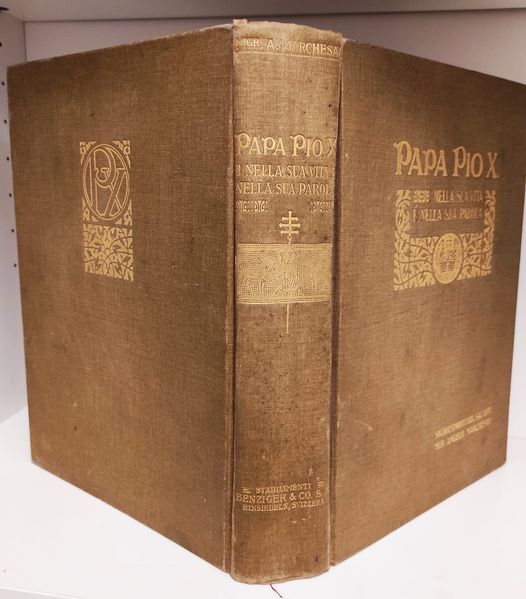 XI, 588 pagine con 24 tav.: ill.; 30 cm. Ritratto di Pio 10. disegnato da G. Szoldatics e protteto da velina. Legatura editoriale in tela con titolo e decorazioni in oro ai piatti e al dorso come da foto. Timbro di possesso al frontespizio, taglio dorato. Rarissimo ed importante volume su Pio X, illustrato con fotografie di Giovanni Ferretto, per la gran parte appositamente eseguite in una famosa campagna fotografica vaticana rilegato Mediocre (Poor) (14415)