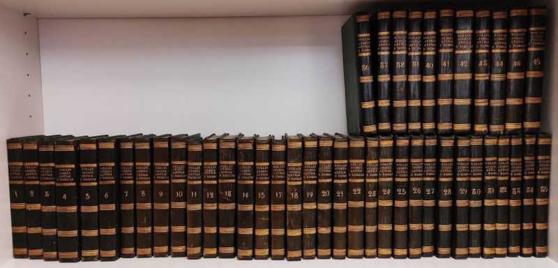 In-16, (mm. 166×99), 46 volumi di circa 300 pagine ciascuno, volume 16 mancante. Rilegatura in mezza pelle coeva con fregi e titoli impressi in oro sul dorso, tagli gialli. Ritratto dell’autore all’antiporta del volume 1, una tavola incisa in rame all’antiporta degli altri volumi per un totale di 45 incisioni che illustrano un passaggio dell’opera. 12 tavole di carte geografiche fuori testo più volte ripiegate. Celebre e rara opera storica dello scrittore francese Rollin (1661-1741), dagli antichi Egizi fino alla morte di Antonio e Cleopatra e ai trionfi di Ottaviano. Rarissime bruniture ma nel complesso interni molto freschi. Una piccola mancanza al margine sup. della pagg. 9-10 del vol. 4. Strappetto con restauro alla tavola del vol. 13. Qualche lieve abrasione ai piatti di alcuni volumi rilegato Molto buono (Very Good) (9854)